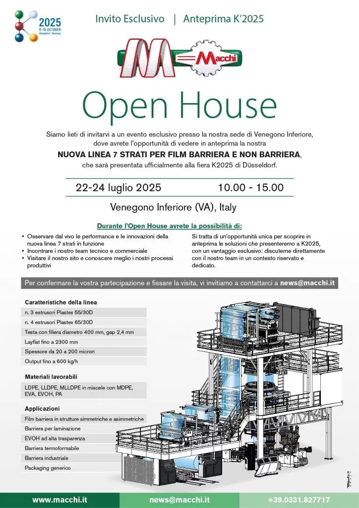 Dal 22 to 24 luglio 2025, Macchi aprirà le potre della propria sede di Venegono Inferiore per mostrare in anteprima la linea 7 strati che verrà ufficialmente presentata alla fiera K'2025 di Duesseldorf.